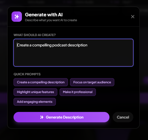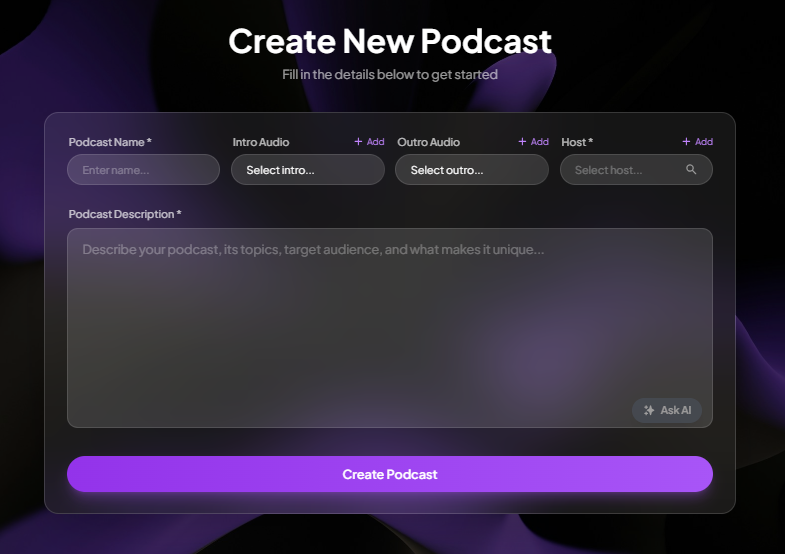 - Add podcast description or click on Ask AI to write description and tell AI what your podcast is about and them click on Generate Description. AI will give you the podcast description. (P.S: You can also edit the description if you want before submitting) Click Create Podcast
